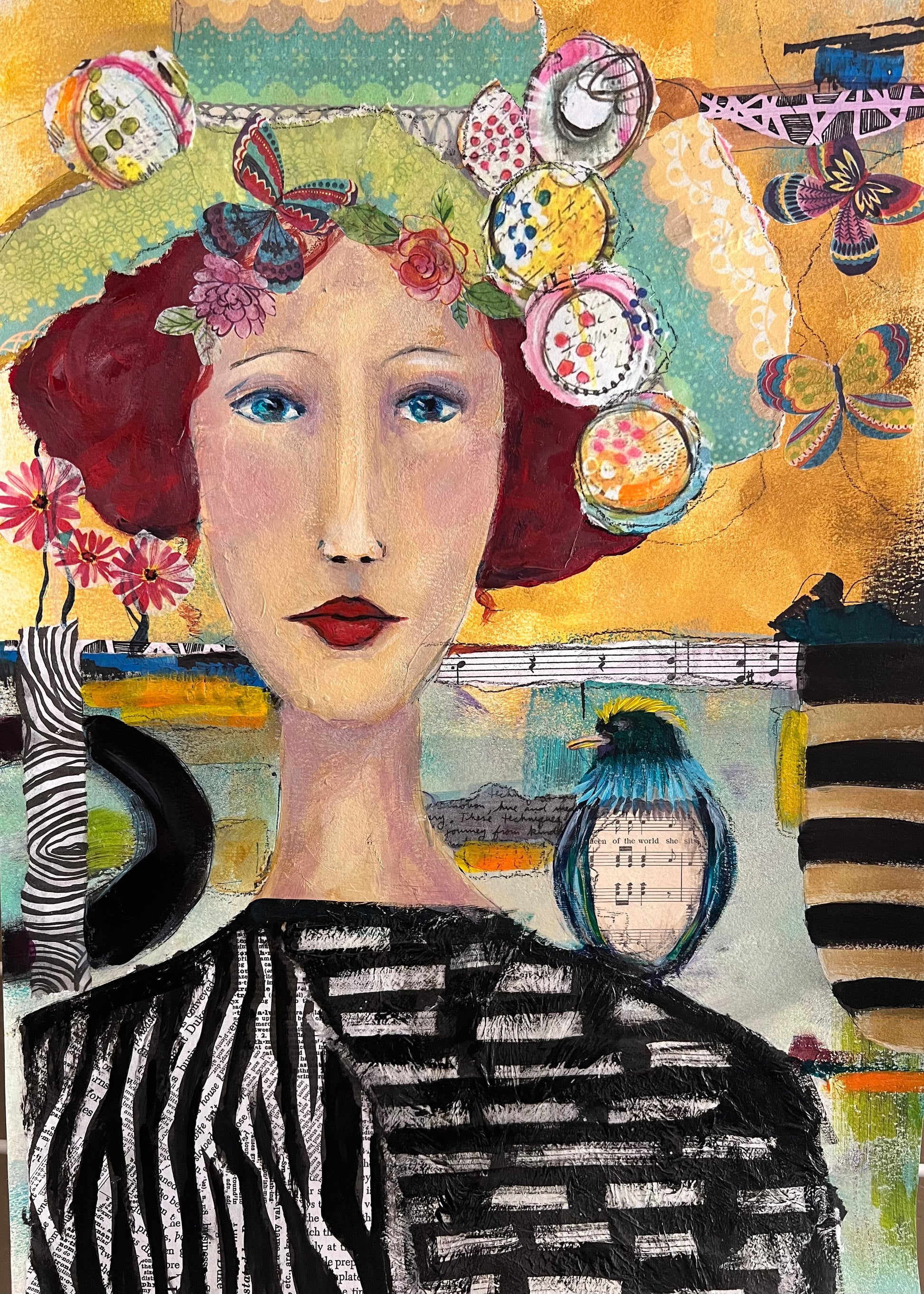 Perched beside her, the bird sings stories in notes and glances—songs only hearts like hers truly hear